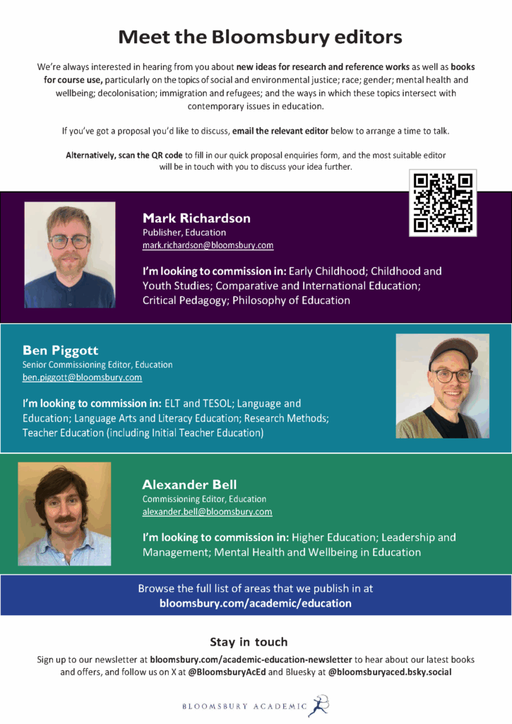 We are committed to providing a high-quality publishing service to academics and students globally, and are strongly devoted to representing diverse voices from around the world and to social justice issues in education. If you’d like to know more about publishing with us or have a new book idea, find more info on the Authors section of our website and email our Commissioning Editor Alexander Bell to arrange a meeting: Alexander.Bell@bloomsbury.com.